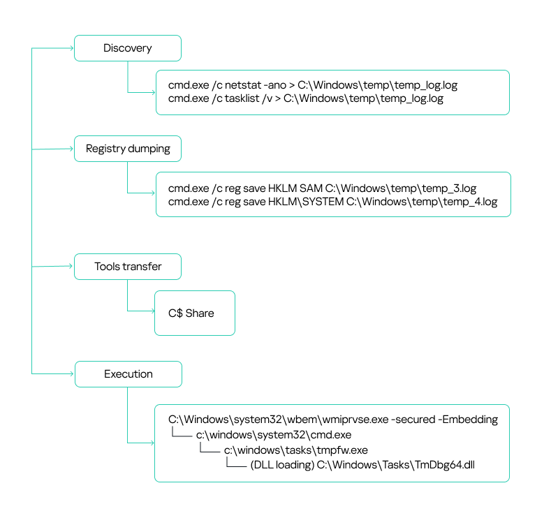 - 복수 백도어 및 접근 경로: 주요 시스템에 다수의 접근 계층을 유지하여 한 경로가 차단되어도 다른 경로로 활동을 지속.
