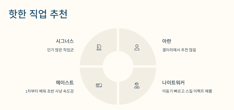 직업은 본인 스타일에 맞게 선택하는 게 좋아요. 시그너스는 추천 많고, 아란도 인기 많아요.