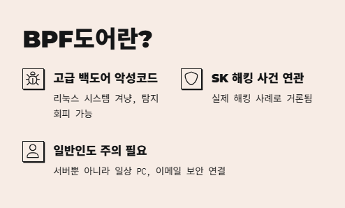 → 리눅스에 숨어서 명령을 받는 고급 해킹 도구로, SK 해킹 사건에도 언급된 정황 있음 - 내가 접한 BPF도어 관련 뉴스와 커뮤니티 반응은?