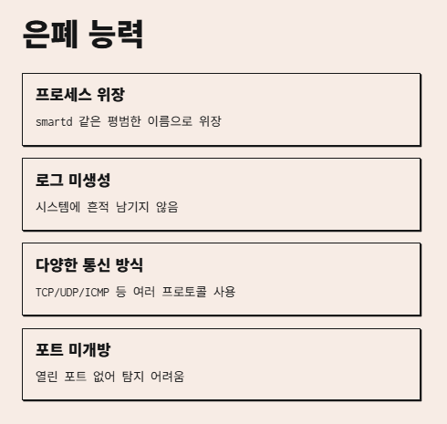 smartd 같은 평범한 이름으로 프로세스를 위장해서 돌아가고, 시스템에 로그도 안 남기고, 명령을 받는 통신도 TCP/UDP/ICMP 등 다양하게 쓰면서, 포트도 안 열려 있어서 탐지도 어려워요.