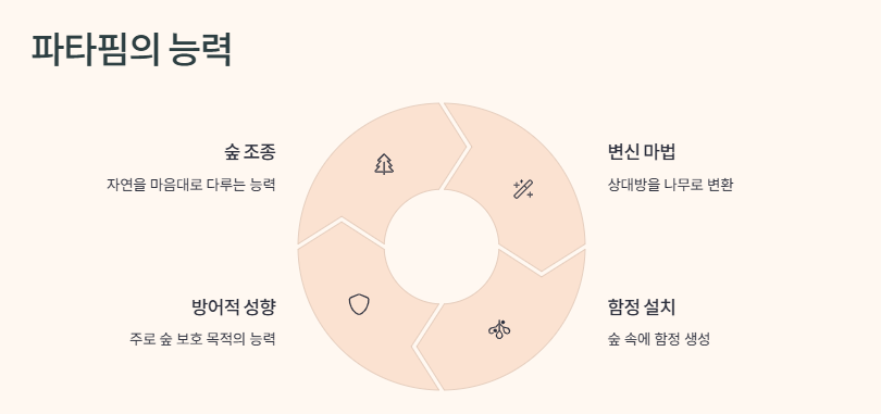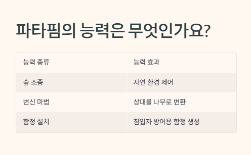 - 파타핌은 숲을 지키고 상대를 나무로 변환하는 능력을 가지고 있습니다.