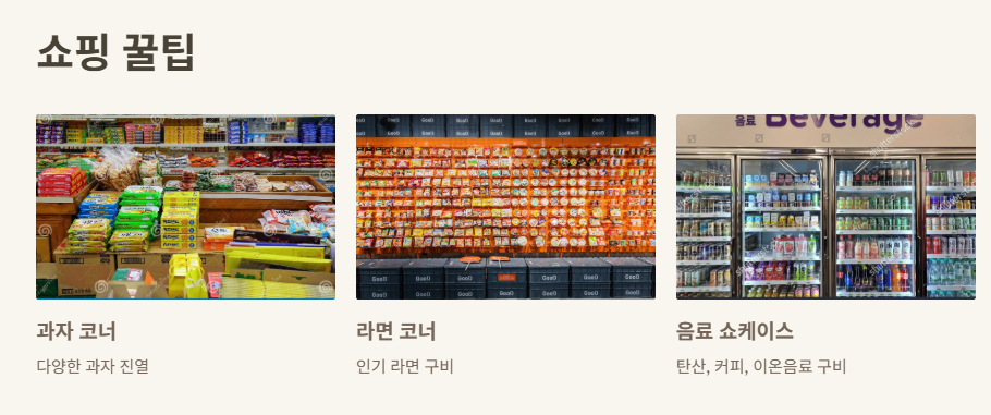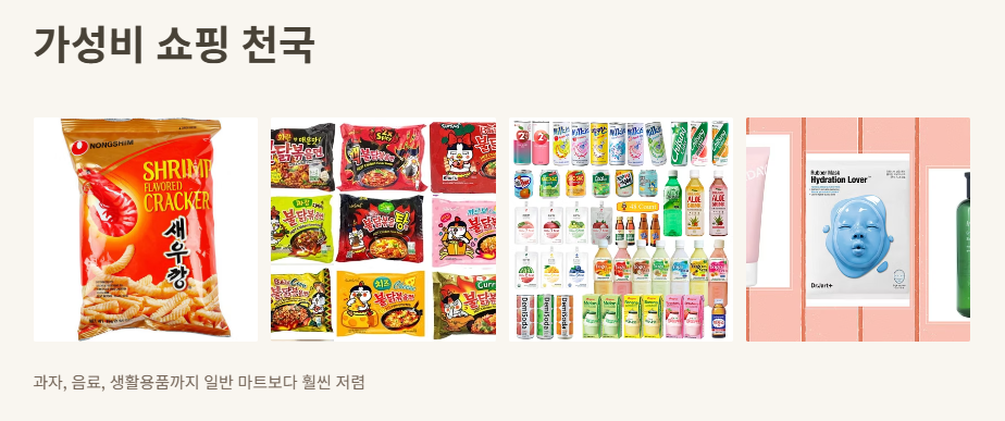 과자, 음료, 생활용품, 주류 등 일반 마트보다 저렴하게 득템 가능해요.