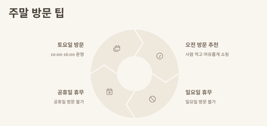 일요일과 공휴일은 휴무, 주말 쇼핑은 토요일 오전 추천!