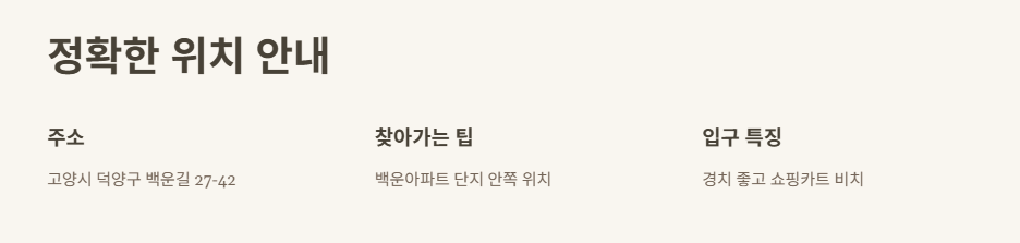 북한산 군마트는 고양시 덕양구 백운길 27-42에 있어. 사실 처음 가봤을 때는 위치 찾느라 좀 헤맸는데, 백운아파트 단지 안쪽이라 찾아가면 입구에서 경치도 멋지고 쇼핑카트까지 비치돼 있더라고.