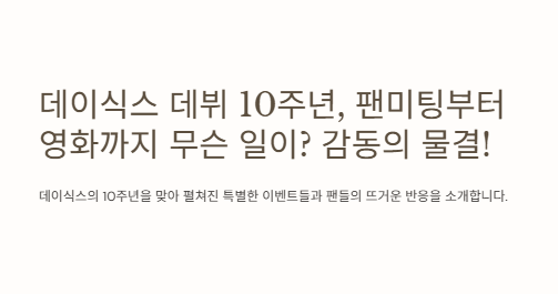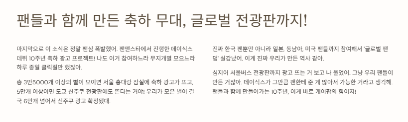 심지어 서울버스 전광판까지 광고 뜨는 거 보고 나 울었어. 그냥 우리 팬들이 만든 거잖아. 데이식스가 그만큼 팬한테 준 게 많아서 가능한 거라고 생각해. 팬들과 함께 만들어가는 10주년, 이게 바로 케이팝의 힘이지!