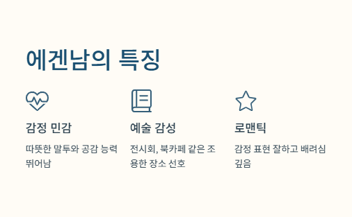 에겐남은 한 마디로 감성적인 남자! 공감 능력도 좋고, 말투나 행동이 부드러워. 혼자 있을 때는 북카페 같은 조용한 장소 좋아하고, 연애할 때도 감정 표현 진짜 잘하는 편이야. 진짜 유명한 연예인 중에 에겐남 스타일인 사람 많잖아. 박보검, 정해인, 차은우 이런 배우들 보면 느낌 오지?