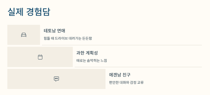 - 유형 테스트를 통해 나와 어울리는 이상형을 찾아보세요. 자기 인식에도 도움이 돼요.