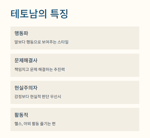 테토남은 완전 반대야. 직설적이고 추진력 있는 스타일! 약간 무뚝뚝해 보일 수 있는데, 사실 속은 따뜻하고 책임감 짱이야. 약속 잘 지키고, 계획 세워서 행동으로 보여주는 거 좋아함. 운동 좋아하고, 리더 역할 자주 맡는 사람 있지? 그게 바로 테토남!