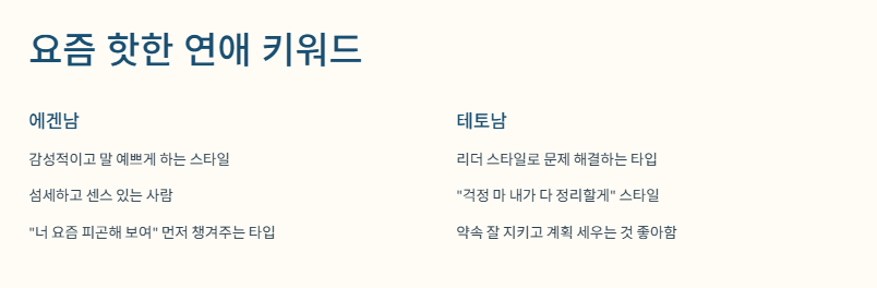 에겐남은 감정 소통에 강하고, 테토남은 행동으로 안정감을 줘요. 본인 성향에 맞춰 고르는 게 좋아요.