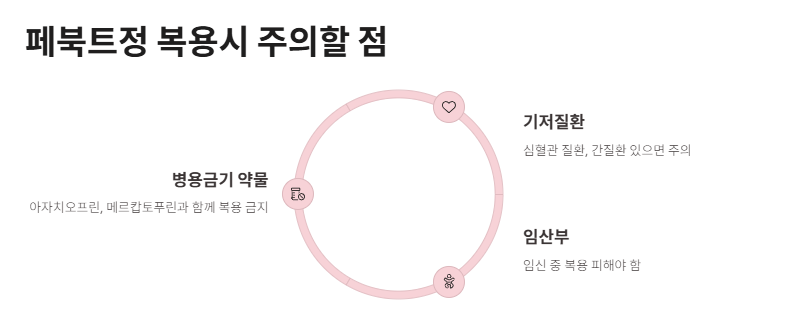 페북트정 복용할 땐 ‘아자치오프린’이나 ‘메르캅토푸린’ 같은 약이랑은 절대 같이 먹으면 안 된대. 혈중농도 올라가서 위험할 수도 있거든. 또 심혈관 질환 이력이 있거나 간질환 있으면 꼭 주의해야 하고, 임산부는 웬만하면 피하는 게 좋아.