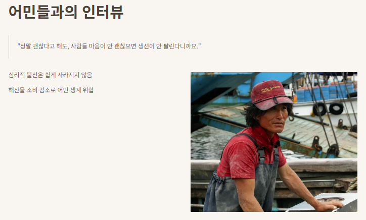 이 주제로 영상 인터뷰들을 보다보면, 실제로 일본 근해나 우리나라 바다에서 일하는 어민들의 인터뷰가 꽤 많아요. 그중 한 어민이 했던 말이 아직도 기억나요.
