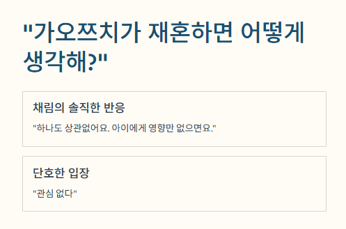 그 영상 보면서 나도 약간 충격받았던 게, 채림 언니가 정말 너무 차분하게 말해서... 오히려 슬펐어. 가오쯔치 재혼 가능성에 대해 채림은 단호하게 “관심 없다”고 말했거든. 그리고 자기 재혼에 대해서도 “아들 아빠 말고 다른 사람이랑은 생각해본 적 없다”고 해서 나 진짜 눈물 찔끔...