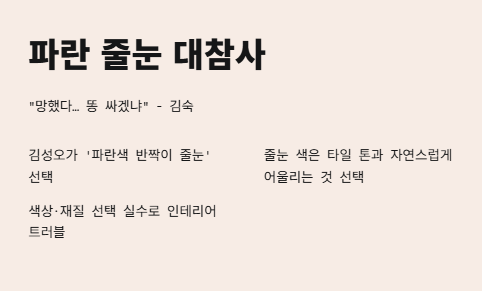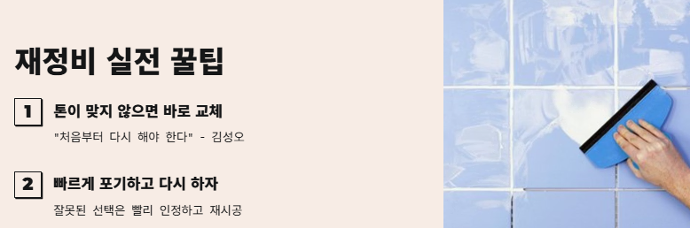 김성오는 시공 후 “처음부터 다시 해야 한다”고 할 만큼 줄눈이 부적합했다고 해요. 저도 욕실 줄눈 재시공하려다가 결국 색상 잘못 선택해 재시공한 적 있습니다. 이럴 땐 그냥 “빠르게 포기하고 다시 하자”가 현명해요.
