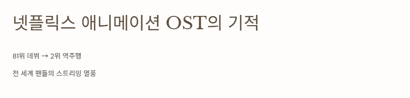 넷플릭스 애니메이션 OST가 빌보드 핫100 2위까지 올라갔다? 나 진짜 처음 듣고 깜짝 놀랐어. 바로 ‘케이팝 데몬 헌터스’ OST인 ‘골든’ 이야기야. 사실 나도 친구들이랑 넷플릭스에서 이 애니를 보고 OST에 꽂혀서 하루종일 반복해서 들었거든. 근데 이게 그냥 내가 좋아하는 노래가 아니라 전 세계 사람들이 같이 듣고 스트리밍하면서 빌보드 핫100에서 2위까지 올랐다는 거야! 진짜 신기하지 않아? 처음 81위로 데뷔했는데 점점 순위가 올라가더니 결국 2위라니, 이건 거의 기적이야.