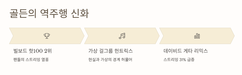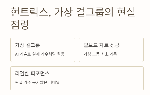 2. 헌트릭스, 가상 걸그룹이 현실 차트를 점령한 이유 가상 걸그룹 헌트릭스가 부른 ‘골든’은 현실과 가상의 경계를 허물며 글로벌 차트를 석권했어요. 팬덤 문화의 진화가 이끌어낸 결과입니다.