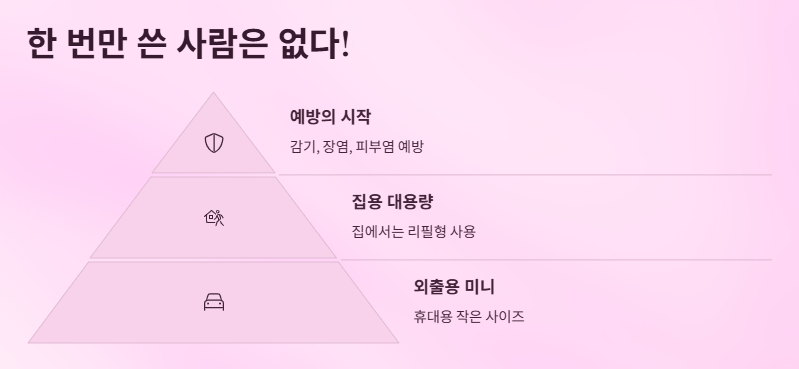 처음엔 그냥 물티슈처럼 쓰다 말겠지 했는데, 지금은 없으면 너무 불안해서 몇 개씩 쟁여놨어요. 집엔 대용량 리필형, 외출용은 작은 사이즈. 완벽 조합이죠.