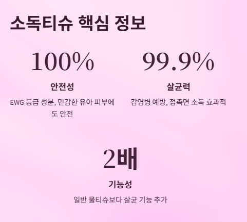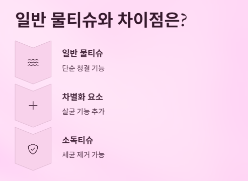 → 일반 물티슈는 단순 청결용, 소독티슈는 살균 기능 포함으로 차별화됩니다.