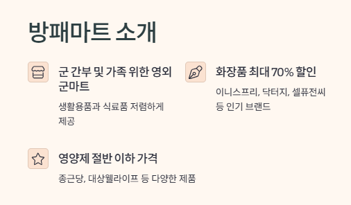 과천 방패마트는 군 간부 및 가족을 위한 영외 군마트로, 다양한 생활용품과 식료품을 저렴한 가격에 제공합니다. 특히 화장품과 영양제는 시중가 대비 큰 할인 혜택이 있어 많은 이용자들에게 인기를 끌고 있습니다.