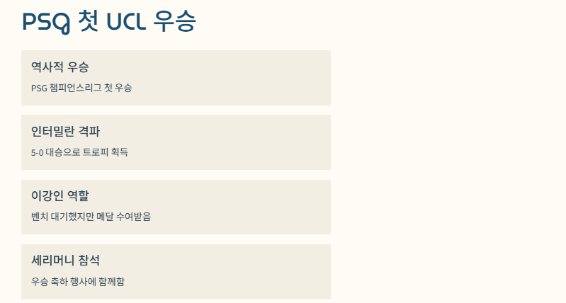 그리고 이강인이 소속된 PSG가 이번 시즌 챔피언스리그에서 드디어 첫 우승을 했어요! 인터밀란을 5-0으로 이겼고, 이강인은 벤치였지만 메달 받았고 세리머니에도 참석했어요. 커리어적으로도 진짜 값진 시즌이었죠.