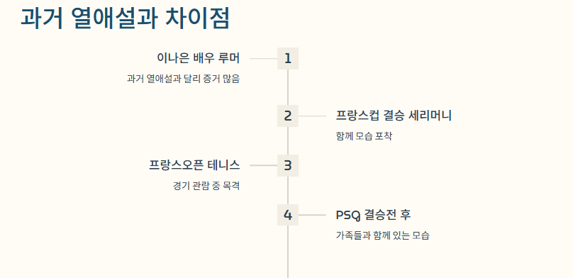 이번 열애설은 과거 이나은 배우와의 루머랑은 다르게, 여러 번 사진으로 공개되기도 했고, 진짜 연인처럼 자연스러운 모습이 많았어요. 2024년 프랑스컵 결승 세리머니, 프랑스오픈 테니스 경기 관람, 심지어 PSG 결승전 끝나고 가족들과 함께 나왔을 때도 옆에 있었다니까요.