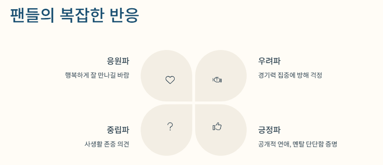 물론 팬들 중엔 “행복하게 잘 만나길” 응원하는 사람들도 있지만, “경기력 집중에 방해되는 거 아냐?”라며 우려하는 시선도 있는 건 사실이에요. 그래도 이렇게 자연스럽고 공개적인 연애라면, 둘 다 멘탈 단단한 거 아닌가 싶어요.