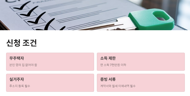 - 국세청 세액공제 기준에 따라 연 소득 7천만 원 이하 무주택 실거주자 대상.