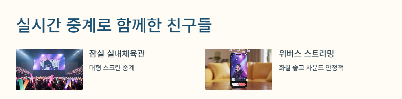 잠실 실내체육관 대형 스크린 중계도 있었고, 위버스 스트리밍으로 실시간 공연 즐긴 아미 친구들 말로는 화질도 좋고 사운드도 안정적이었다고 해. 특히 진의 손키스 LED 조형물 장면에서 댓글창이 폭발했대ㅋㅋㅋㅋ