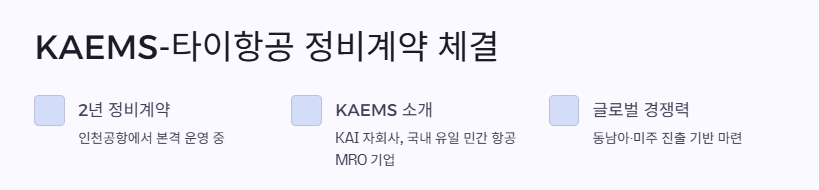 이거 진짜 뉴스로 처음 봤을 땐 ‘어? KAEMS가 뭐지?’ 싶었는데, 알고 보니까 한국항공우주산업(KAI)의 자회사더라고. 이번에 태국 타이항공이랑 2년 동안 인천공항에서 정비 계약 맺은 거야. 나처럼 타이항공 자주 타는 사람한테는 완전 반가운 소식이지!