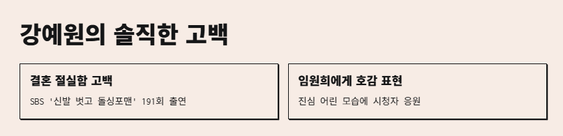 게스트들의 현실적인 연애 고백, 특히 강예원의 진심 어린 결혼 바람이 핵심이에요.