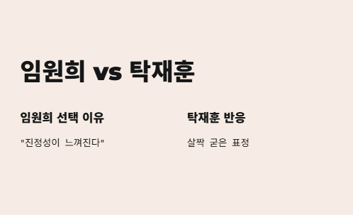 언니가 임원희를 택한 이유가 “진정성이 느껴진다”는 말이었는데, 이거 보고 탁재훈 얼굴 살짝 굳는 거 웃겼지만 이해됐어ㅋㅋ
