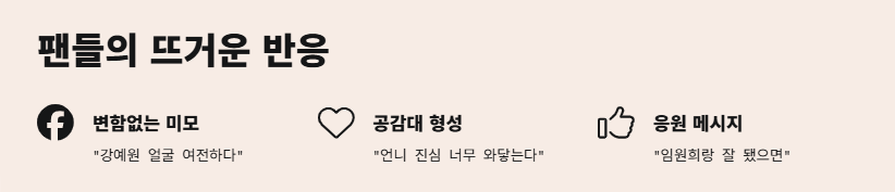 나처럼 감동받은 팬들 진짜 많았음! SNS에서도 “강예원 얼굴 여전하다”, “언니 진심 너무 와닿는다”, “임원희랑 잘 됐으면” 등등 응원 댓글 가득했음.