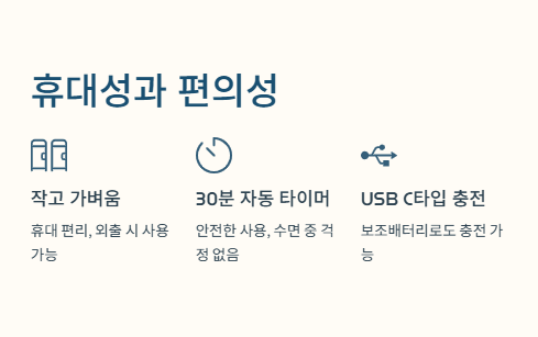 게다가 30분 자동 타이머가 있어서 자다가도 걱정 없고, 충전도 USB C타입이라 보조배터리로도 가능해서 진짜 실용적이에요.