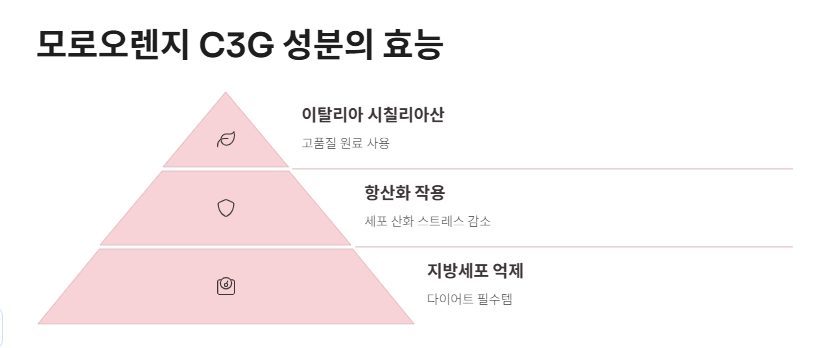 – 이탈리아 시칠리아산 모로오렌지에서 추출한 C3G는 세포 산화 스트레스를 줄이는 강력한 항산화 성분으로, 체지방 감소에 도움을 줄 수 있음