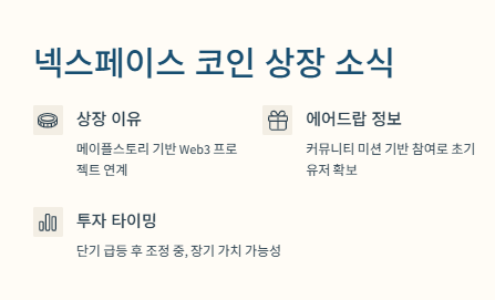 - 넥스페이스 코인 상장 이유: 메이플스토리 기반 Web3 프로젝트와 연계된 코인으로 실사용성 확보.