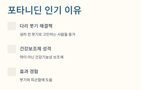 요즘 다리 붓기나 생리 전 붓기로 고민하는 사람들이 많아지면서 '포타니딘'이란 성분이 슬금슬금 입소문을 타기 시작했어요. 저도 붓기 때문에 너무 힘들어서 포타니딘 약국 검색해봤고, 직접 먹어본 후기를 정리해볼게요. 약은 아니지만 건강보조제 느낌으로 관심 가질만한 포인트가 있었고, 붓기뿐 아니라 피곤함에도 도움됐던 경험을 바탕으로 공유합니다.