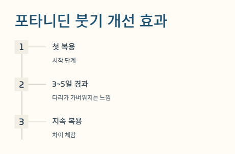 이게 진짜 신기했는데요, 포타니딘 붓기 완화 효과는 느껴졌어요. 붓기가 덜해지면서 다리가 살짝 가벼워졌다고 해야 하나? 솔직히 한 번에 뚜렷하게 드라마틱한 변화는 아니지만, 3~5일 정도 꾸준히 먹으니까 차이가 있었어요.
