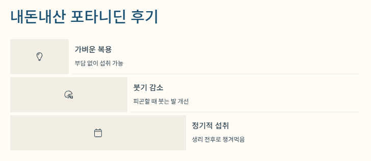 제가 직접 포타니딘 내돈내산으로 사서 먹어봤을 때 제일 좋았던 점은 '가볍게 먹고 효과를 느낄 수 있다'는 점이었어요. 피곤할 때 붓는 발, 앉았다 일어났을 때 무거운 종아리 느낌이 조금씩 줄어들었고요.