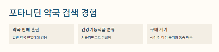 솔직히 처음엔 "포타니딘 약국에 파는 거 맞아?" 하고 검색하다가 조금 혼란스러웠어요. 약국에 딱 진열되어 있는 게 아니라, 건강기능식품이나 서플리먼트 쪽으로 따로 취급되는 제품에 포함되어 있더라고요. 저는 생리 전에 다리가 붓고 종아리가 아픈 편이라, 붓기 개선에 좋다는 말에 혹해서 결국 구매해봤어요.
