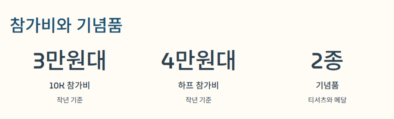 전년도 기준 10K 약 30,000원, 하프 마라톤 약 40,000원이었으며 올해는 추후 공지 예정이에요.