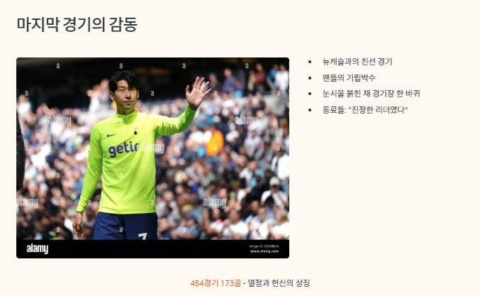 토트넘에서의 마지막 경기였던 뉴캐슬과의 친선 경기에서는 팬들의 기립박수가 경기장 전체를 감싸며 역사적인 순간을 만들었어요. 손흥민은 눈시울이 붉어진 채 경기장을 한 바퀴 돌며 팬들에게 손을 흔들었고, 그 장면은 전 세계 축구 팬들에게도 큰 감동을 주었죠. 토트넘은 그의 업적을 기리며 공식 SNS와 웹사이트에서 그의 기록을 공개했고, 팀 동료들 역시 “손흥민은 진정한 리더였다”며 아쉬움을 전했어요. 그가 남긴 454경기 173골이라는 기록은 단순한 숫자가 아닌 열정과 헌신의 상징으로 기억될 거예요.