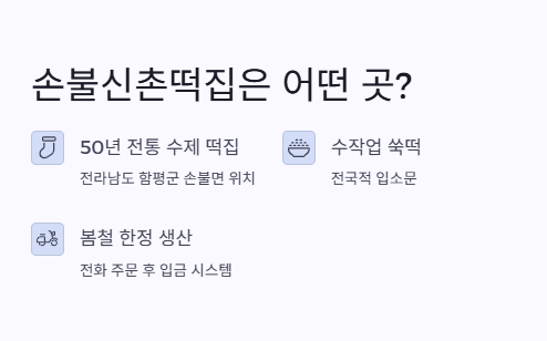 전라남도 함평군 손불면에 위치한 50년 전통 수제 떡집으로, 수작업 쑥떡으로 전국적인 입소문을 얻은 곳입니다.