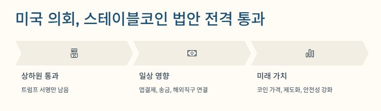 야 진짜 이번 뉴스 보고 순간 숨 멎을 뻔했어ㅋㅋ 나 요즘 블록체인이랑 디지털 화폐에 관심 생겨서 이것저것 보고 있었는데, 미국이 갑자기 스테이블코인 법안을 통과시켰다는 거야. 그것도 그냥 통과가 아니라 상하원 둘 다! 이젠 트럼프 서명만 남았다는데, 솔직히 이거 엄청 큰일이야.