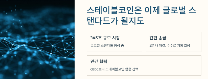 또 하나, CBDC(중앙은행 디지털화폐)도 있긴 해. 근데 미국은 그거보다 스테이블코인을 활용하겠다는 쪽이야. 민간이랑 손잡고 효율적으로 가겠다는 거지. 완전 합리적이지 않아? 이러니 세계가 주목하는 거겠지.