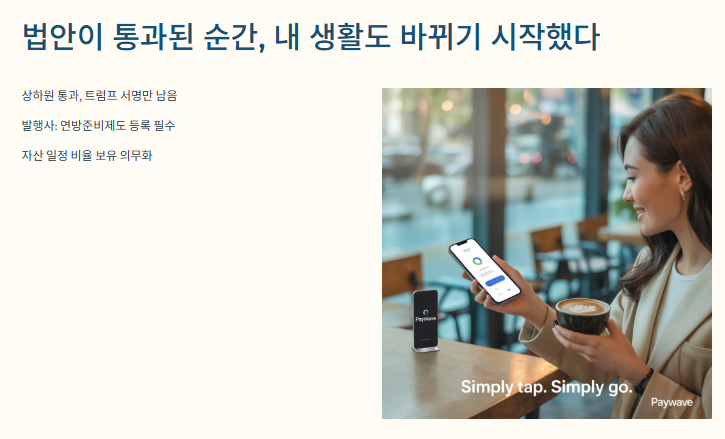 특히 나는 암호화폐 투자까진 안 해봤지만, 친구가 디지털지갑 앱 소개해줘서 요즘 공부하고 있어. 그런 앱에서 스테이블코인을 담아두면 이자도 주고, 결제도 되고, 송금도 되고. 이 모든 게 법적으로 뒷받침된다고 생각해봐. 얼마나 믿음직하겠어.