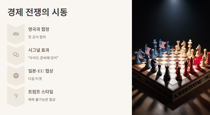요즘 미국이 중국이랑도 무역 문제로 계속 엮이고 있는 거 알지? 근데 미국이 이렇게 영국하고 먼저 공식 합의를 맺은 건 진짜 의미 있는 시그널 같아. 미국이 영국과 협정부터 체결한 건 다른 나라에도 “우리도 준비돼 있어”라는 메시지처럼 느껴졌거든. 지금 일본이랑 EU도 협상 중인데, 트럼프 스타일상 또 어떤 폭탄 발언이 나올지 모르겠어.