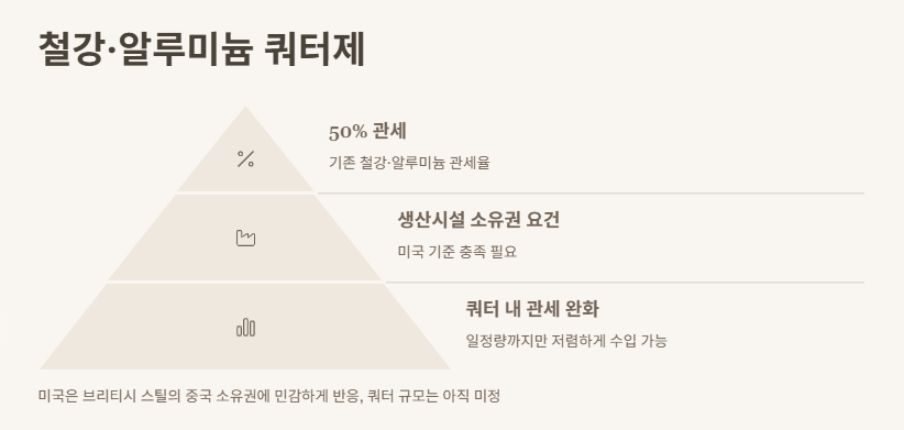 나 이번 기회에 진짜 철강·알루미늄 관세가 얼마나 심했는지도 처음 알았어. 무려 50%래. 근데 이번 트럼프 英 무역협정에서는 영국이 미국의 생산시설 소유권 요건 같은 걸 충족하면, 쿼터 안에서 관세가 완화된대. 이게 뭐냐면, 일정량까지만 저렴하게 들여오고 그 이상은 다시 높은 관세 부과하는 시스템이야.