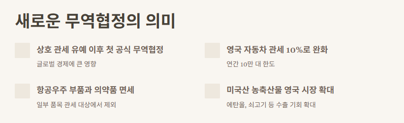 : 일부 항공우주 부품은 관세 대상에서 빠지고, 의약품도 우대 조건 검토 중이에요. - 미국산 농축산물 영국 시장 확대